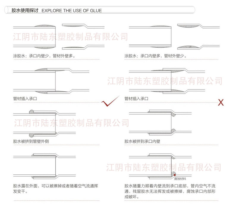 當然,在本網(wǎng)站中,江陰市陸東塑膠制品有限公司已經(jīng)在之前的技術文獻里發(fā)表過圖示,正確涂抹膠水,安裝水管的對比圖,在這里,再次發(fā)布給做工程的同僚們看一下,加深印象,這樣在做PVC-U化工管件、UPVC工業(yè)管件這些對接操作的時候就不會有任何問題了。